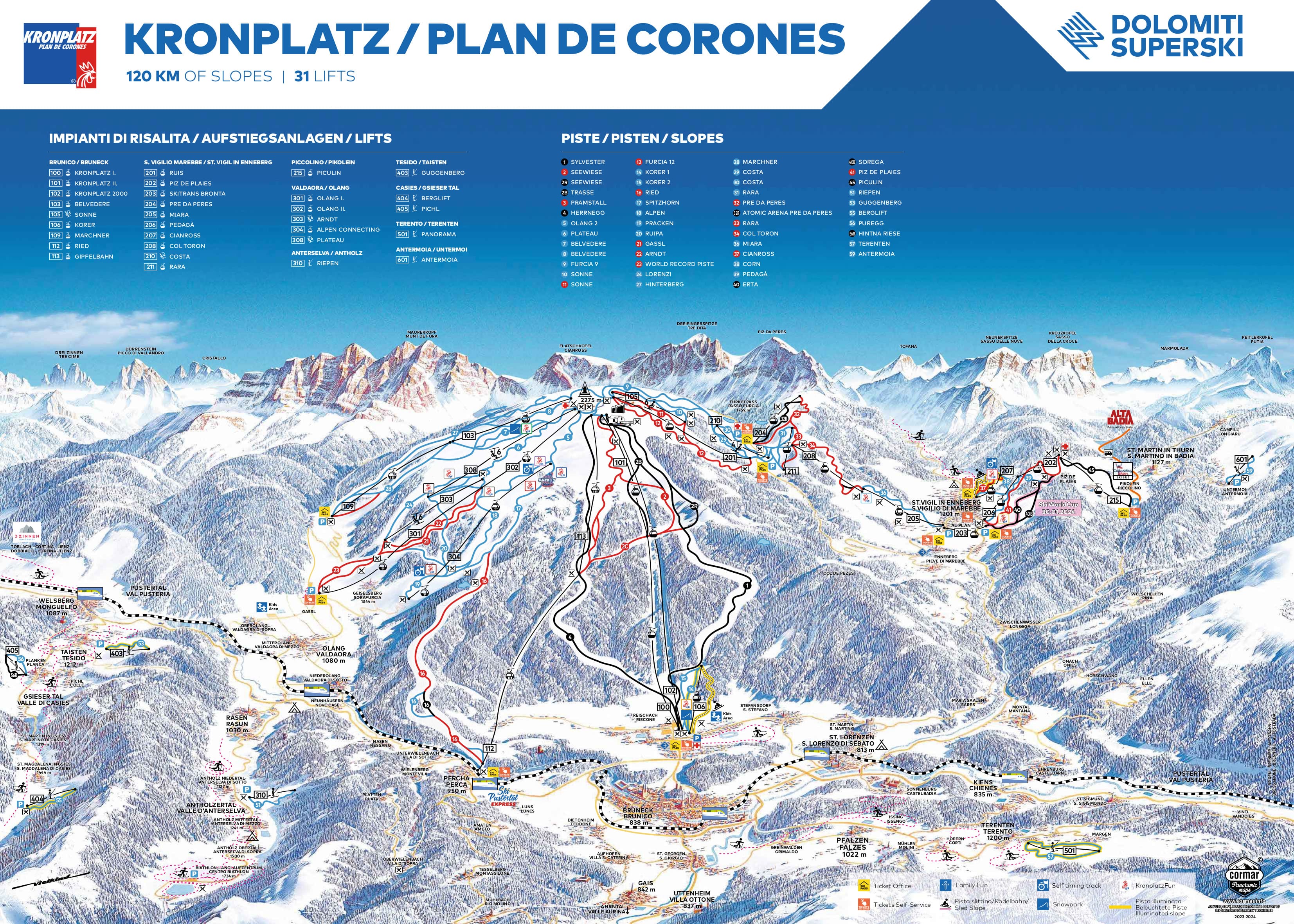 Plan de Corones / Kronplatz es una estación de esquí en Italia con 120 km de pistas esquiables, se posiciona como uno de los grandes dominios de Italia. Con cotas entre 935 m y 2275 m de altitud y un desnivel de 1340 metros. Sus pistas se distribuyen en 4 verdes, 13 azules, 16 rojas y 10 negras. El forfait de día tiene un precio orientativo de 74 €.