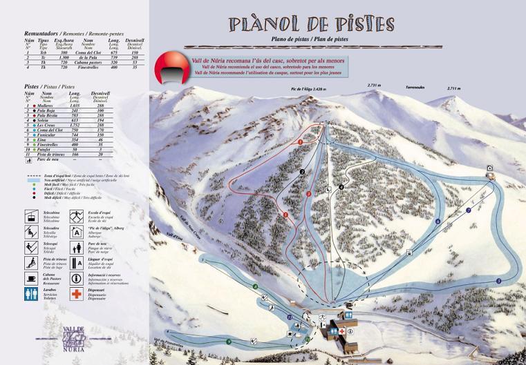Vall de Núria es una estación de esquí en España con 7.6 km de pistas, ideal para jornadas de esquí sin masificación. Con cotas entre 1964 m y 2252 m de altitud y un desnivel de 288 metros. Sus pistas se distribuyen en 3 verdes, 3 azules, 3 rojas y 2 negras. El forfait de día tiene un precio orientativo de 39.5 €.